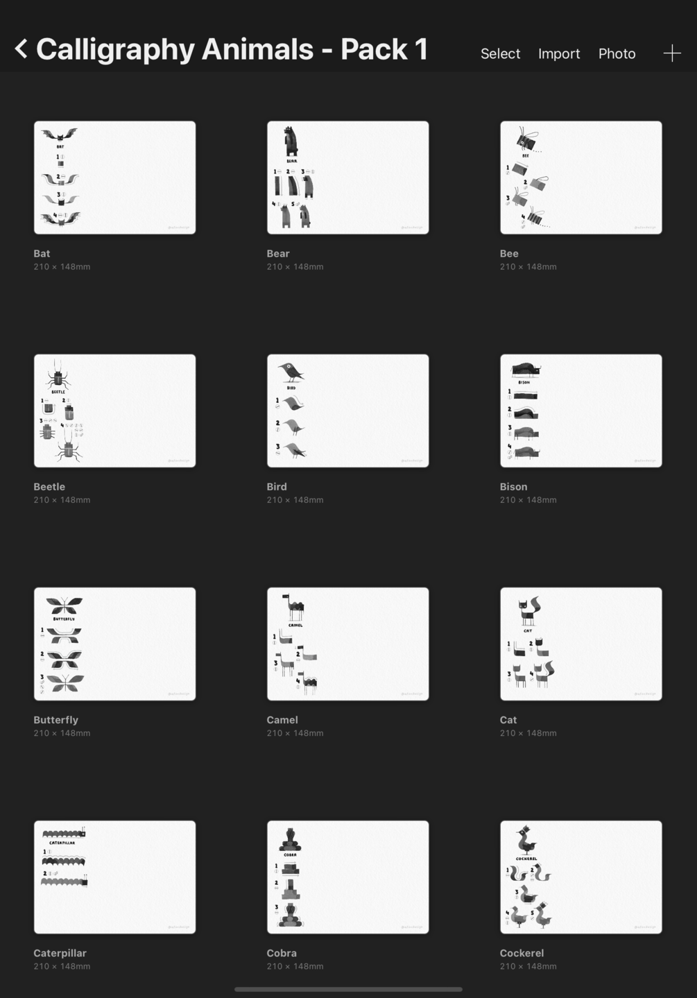 Calligra brush pack (6 unique Procreate brushes) + 20 calligraphy animal instruction pages (to be used in Procreate) + an A4 page of paper nib templates